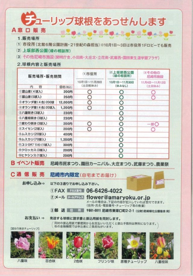 購入ご希望の方は、通信販売申込書に必要事項をご記入の上、FAXにてお申込みいただくか、電子メールに住所・氏名・電話番号・チューリップ等の数量をご記入の上、下記メールアドレスに送信してください。