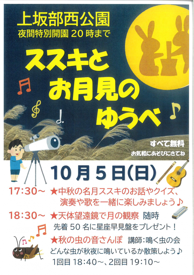 夜間特別開園します。望遠鏡で月の観察、昆虫の先生と虫の音を聞きながら園内散策など。芝生広場では音楽の演奏やクイズ、行事植物ススキの紹介などをお楽しみください。秋の夜をたのしみましょう♪