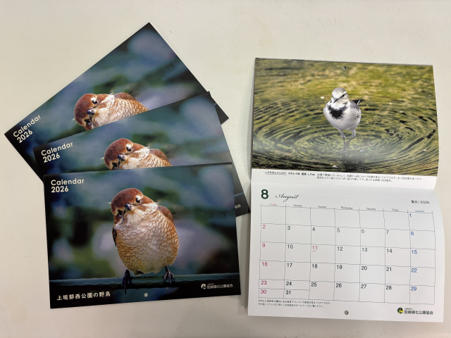 2026協会オリジナルカレンダーを制作しました。 今回は、上坂部西公園で見られる野鳥をテーマに、同公園内で撮影した魅力あふれる野鳥の写真を使って作成しました。 壁掛けタイプ、A4中綴じ(A3判縦サイズ)、1ヶ月毎の表示です。 12月10日から、上坂部西公園緑の相談所で無料配布します。 なくなり次第、配布を終了させていただきます。