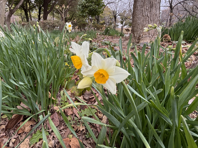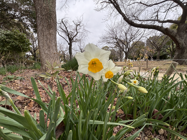 近松公園でスイセンが咲いています。 スイセンはヒガンバナ科スイセン属の多年草。 ラッパのような形の花を咲かせるスイセンは、ガーデニングでも人気の花で、品種改良も多く行われています。 種類によって見た目や花期の違いなどさまざまで、冬から春にかけて白や黄の花を咲かせます。 近松公園東側の東屋付近や北側の園路沿いなどでご覧いただけます。