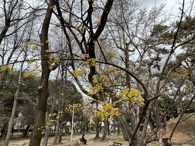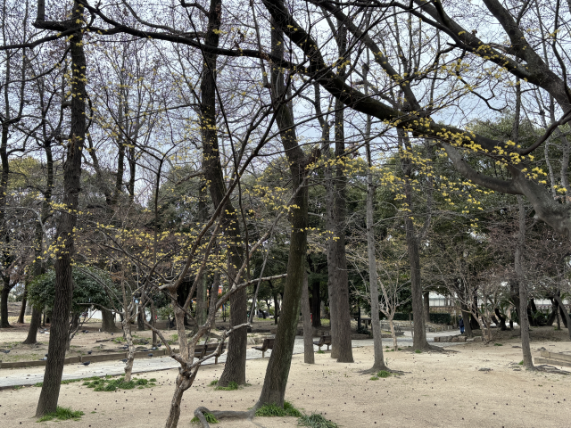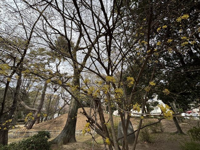 大井戸公園でサンシュユが咲いています。 サンシュユ(山茱萸)は、ミズキ科ミズキ属の落葉小高木。 早春から春(3から4月上旬)にかけて、若葉に先立って木全体に黄色い花を咲かせ、秋にはグミに似た赤い実をつけます。 マンサクとともに早春に咲く花木の代表として親しまれています。 大井戸公園の南東、大井戸古墳周辺でご覧いただけます。