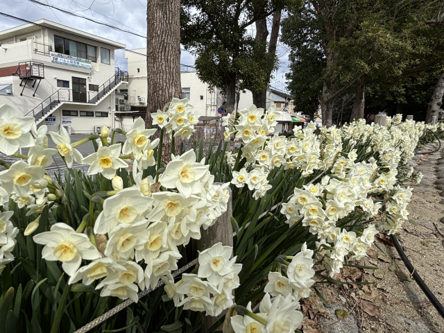 近松公園の北側園路沿いのスイセンが見頃です。 スイセンはヒガンバナ科スイセン属の多年草。 ラッパのような形の花を咲かせるスイセンは、ガーデニングでも人気の花で、品種改良も多く行われています。 種類によって見た目や花期の違いなどさまざまで、冬から春にかけて白や黄の花を咲かせます。 近松公園東側の東屋付近や北側の園路沿いなどでご覧いただけます。