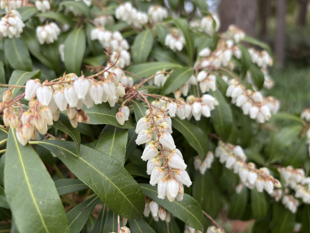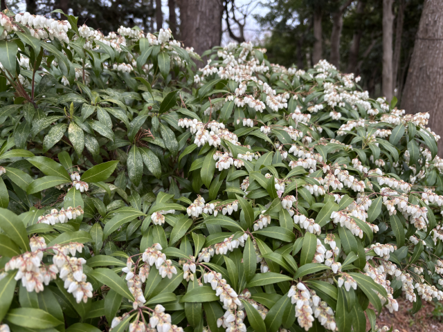 近松公園でアセビ(馬酔木)が咲いています。 アセビは、ツツジ科アセビ属の常緑低木。 早春になると枝先に10センチメートルほどの複総状の花序を垂らし、長さ5ミリメートルほどの白い壷状の花を多数咲かせます。 漢字の「馬酔木」は、馬が葉を食べれば毒に当たり、酔うようにふらつくようになるというところからついたとされています。 園内各所でご覧いただけます。