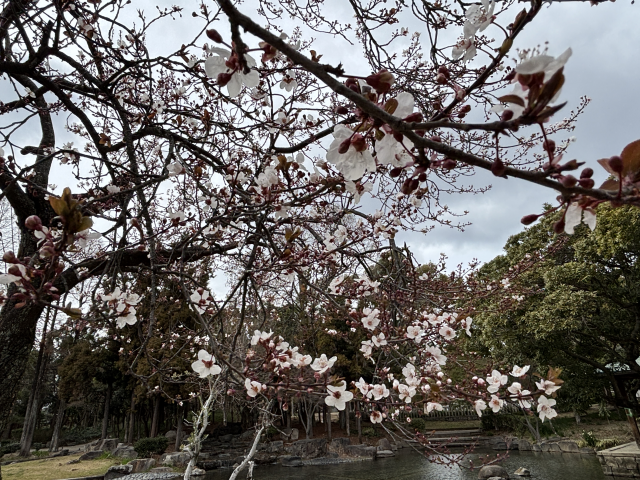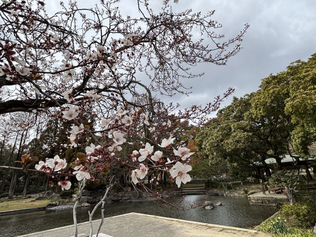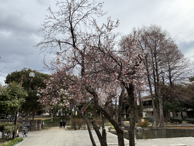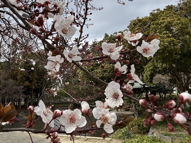 近松公園でべニバスモモ(紅葉李)が咲いています。 べニバスモモは、観賞用に改良されたバラ科の落葉小高木です。 ソメイヨシノとよく似た淡桃色の小さな花が多数つきますが、スモモの仲間で、ソメイヨシノより一週間ほど早く開花します。 萼(がく)は赤紫色で美しく、葉は新葉から紫紅色となり次第に深みを増します。 近松公園の池の前でご覧いただけます。
