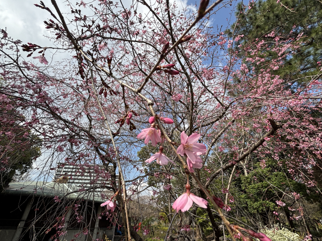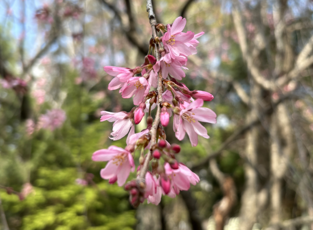 上坂部西公園でシダレザクラが咲き始めました。 シダレザクラ(枝垂桜)は、バラ科の落葉高木。 エドヒガンの変種で、枝がやわらかく枝垂れ、ソメイヨシノが咲く少し前に淡紅色の一重の花を咲かせます。 緑の相談所の南側でご覧いただけます。