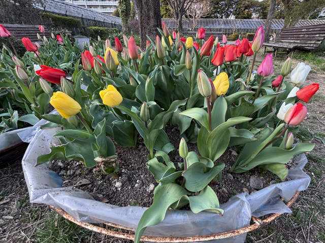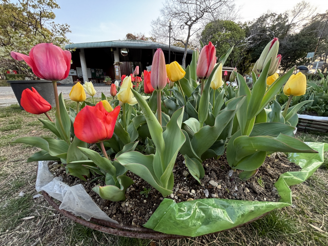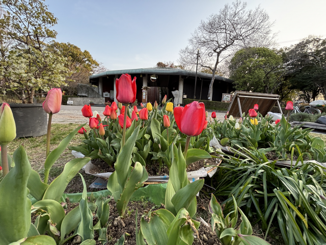 上坂部西公園の緑の相談所前広場にあるプランターのチューリップが咲き始めました。 地植えのチューリップの開花はもう少し先になりそうです。 公園にお越しの際は、是非ご覧ください。