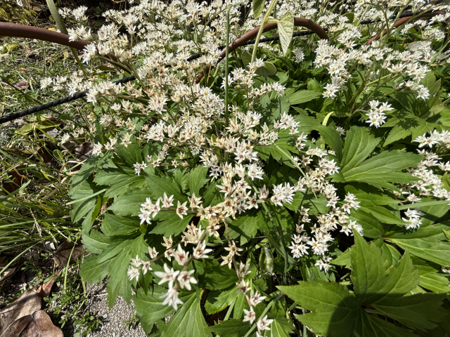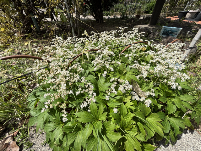 春に、地面を這う頑丈な根茎から、ヤツデやモミジを思わせるような5~9裂に切れ込んだ葉を数枚広げます。