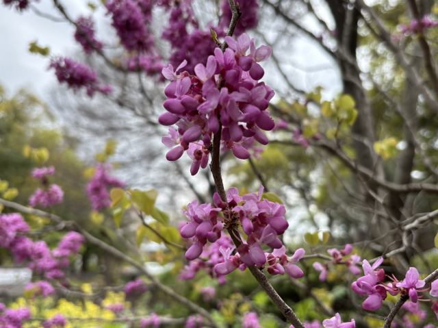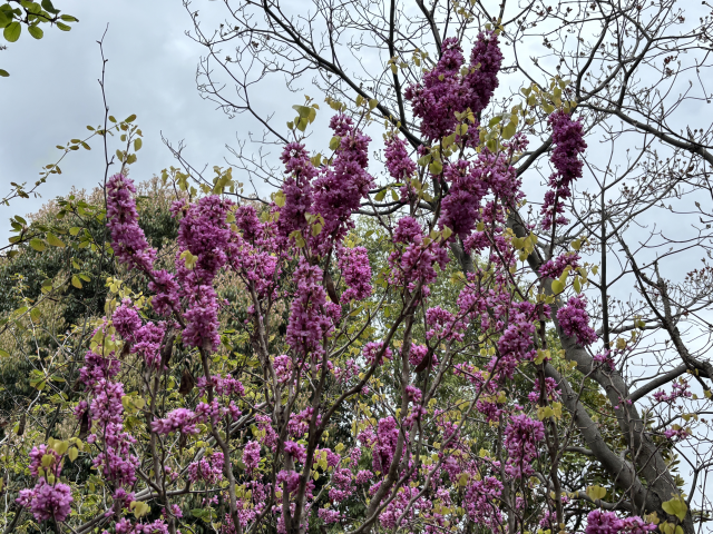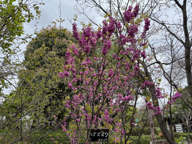 上坂部西公園でハナズオウが咲いています。 ハナズオウ(花蘇芳)は中国原産のマメ科の落葉低木で、3から4月頃葉に先立って紅色から赤紫で長さ1センチメートルほどの蝶形の花を咲かせます。 花には花柄がなく、枝から直接に花を付けます。 花蘇芳の名は、花弁の色がスオウ(蘇芳)で染めた色に似ているためです。