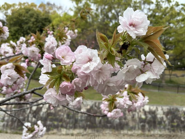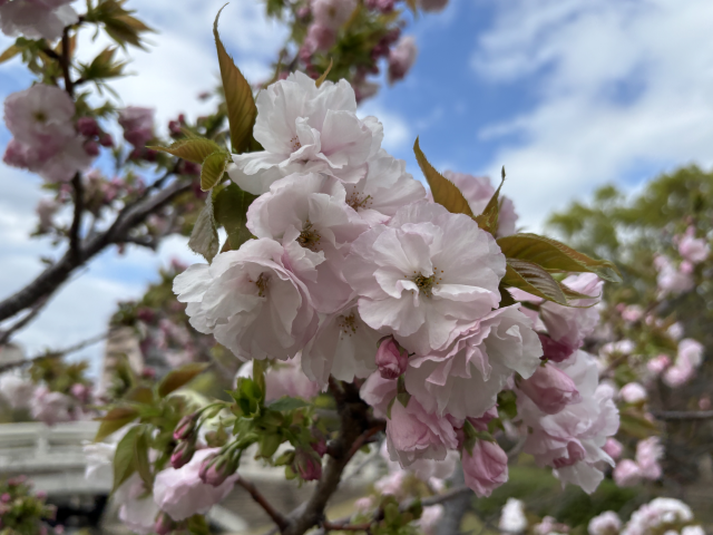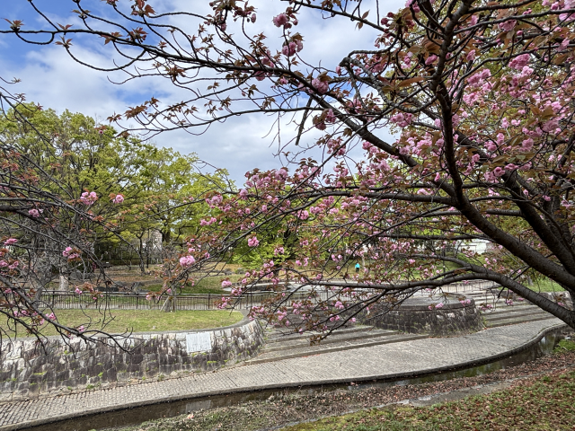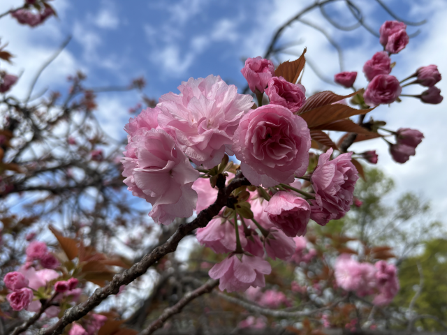 上坂部西公園でヤエザクラが咲き始めました。 ヤエザクラ(八重桜)は、八重咲きになるサクラの総称で、非常に多くの栽培品種があります。 多くはソメイヨシノに比べて開花期が1から2週間ほど遅く、ちょうどソメイヨシノが散るのと同じ時期に開花を始めます。 上坂部西公園芝生広場の東側、昆陽川沿いに多く植えられています。