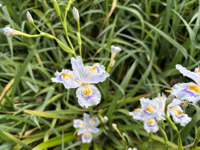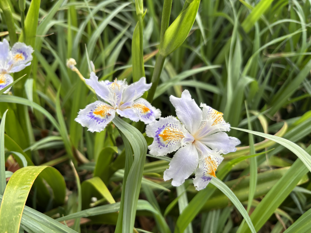 上坂部西公園でシャガが咲いています。 シャガ(射干)は、アヤメ科アヤメ属の常緑多年草。 日本各地の低地や人里近くの湿った森林などに群生します。 春に茎を伸ばして、その先に白地に濃い紫と黄色の斑点が入る花を多数咲かせます。 上坂部西公園の西側園路沿いのほか、園内各所で見られます。