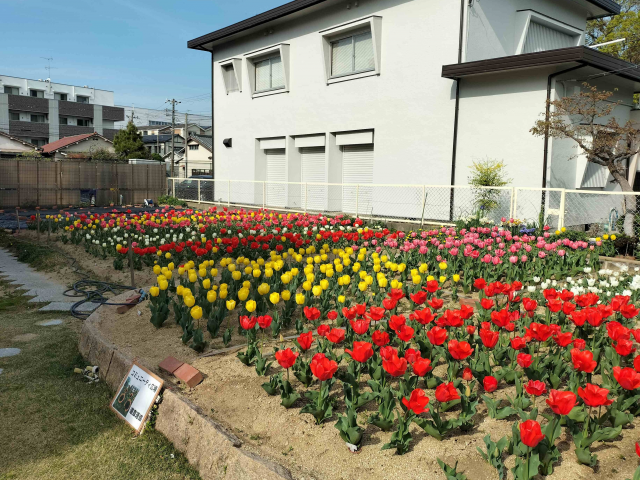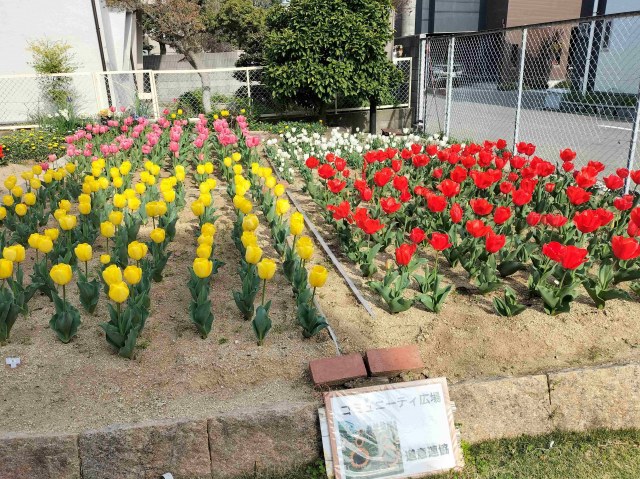 道意コミュニティでチューリップ約600球が見頃です。 この花壇は、「花のまちあまがさきチューリップ運動」の一環で植栽しており、植栽しているチューリップ球根は、多くの企業・団体様にご寄付いただいたものになります。是非ご覧ください。