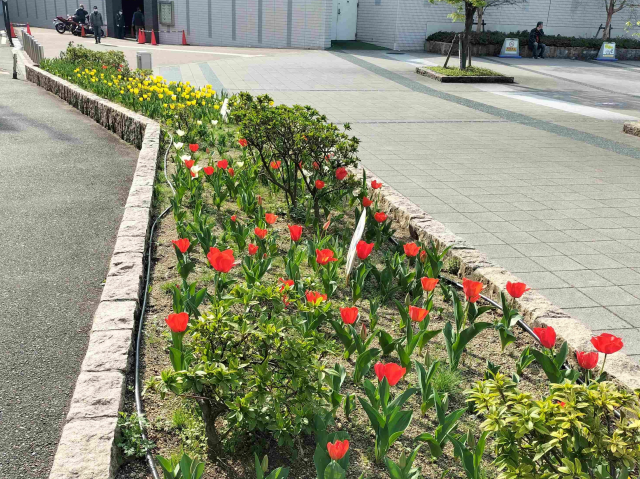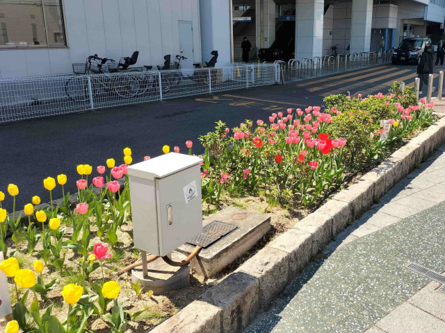 阪神センタープール前駅北広場でチューリップ約1,000球が見頃です。 この花壇は、「花のまちあまがさきチューリップ運動」の一環で植栽しており、植栽しているチューリップ球根は、多くの企業・団体様にご寄付いただいたものになります。是非ご覧ください。