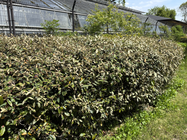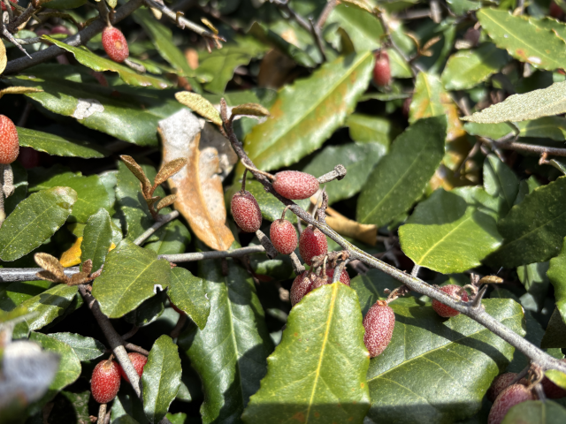 ナワシログミ(苗代茱萸)はグミ科グミ属の常緑低木。 稲の苗代を作る頃(4から5月頃)に果実が熟すグミでことから名付けられました。 上坂部西公園の温室前でご覧いただけます。
