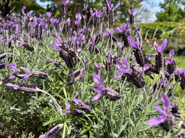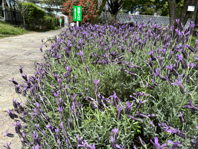 上坂部西公園でフレンチラベンダーが咲いています。 フレンチラベンダーは「ストエカス系」のラベンダーを代表する品種です。 4月から7月頃に、甘い香りを漂わせながら、うさぎの耳のようなかわいらしい花を咲かせます。 ラベンダーの中では暑さに強く夏越しがしやすい種類で、育てやすいハーブとして知られています。 上坂部西公園の緑の相談所から温室に向かう通路沿いでご覧いただけます。