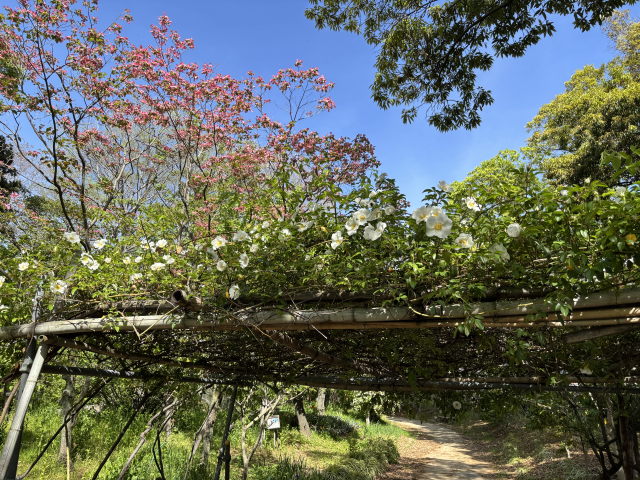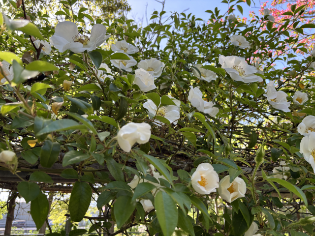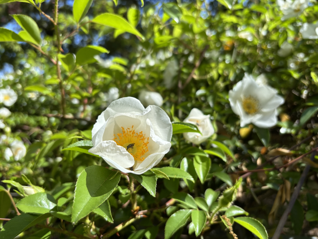 上坂部西公園でナニワイバラ咲いています。 コウシンバラは野生のバラで、ツル性の常緑低木。花は白色の一重咲きで大きく、枝先に1個ずつつき、芳香があります。果実はオレンジ色に熟して、細い刺が蜜に生えます。また、茎にはかぎ状の強い刺があります。。 上坂部西公園の南側園路でご覧いただけます。
