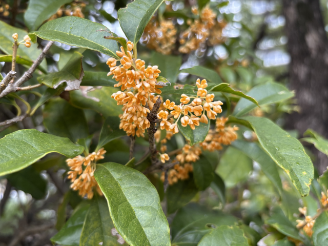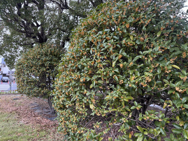 上坂部西公園でキンモクセイが咲いています。 キンモクセイ(金木犀)は、モクセイ科の常緑小高木樹で、市内の公園や庭園などによく植栽されています。 例年10月頃に橙黄色の花を咲かせて甘い香りを放ち、ジンチョウゲ、クチナシと合わせて、日本の三大芳香木のひとつに数えられています。 公園メイン園路のほか、園内随所でご覧いただけます。