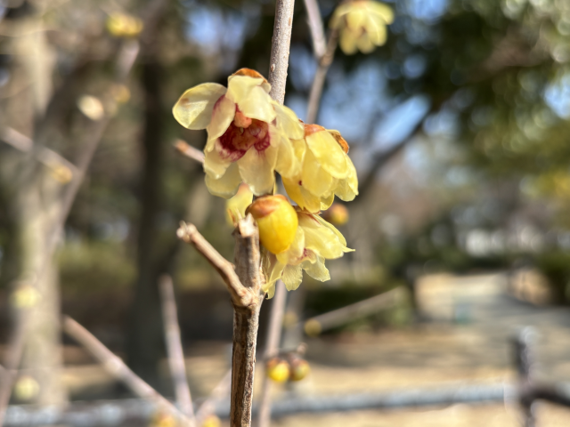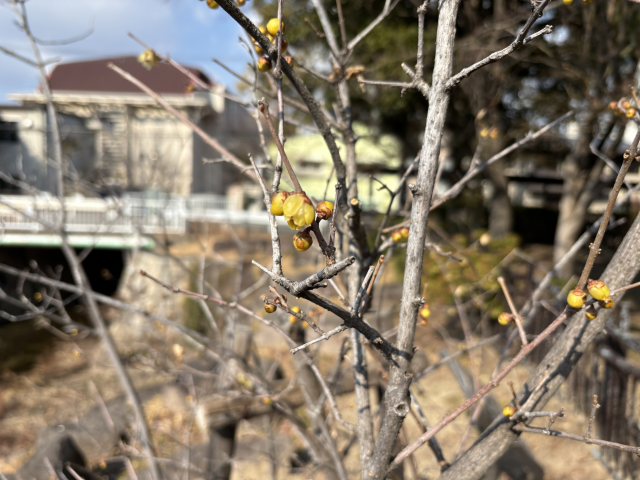 上坂部西公園でロウバイが咲いています。 ロウバイ(蝋梅)は、1月から2月にかけて、まるでロウ細工のような黄色く甘い香りの花を咲かせる中国原産の落葉樹で、中国では、ウメ、スイセン、ツバキとともに、「雪中四友」として尊ばれています。 上坂部西公園の北東、昆陽川に架かる橋のたもとでご覧いただけます。